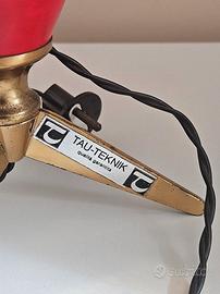 Lampada da tavolo trepiede dal design iconico degli anni '50, prodotta da Tau-Teknik. Stile Mid-Century modernariato ispirato a Stilnovo, Arredoluce, Stilux. - Misure: Altezza 19 cm - Struttura in metallo e ottone. - Finitura bicolore rosso e ottone. Attacco lampadina piccolo E14. Lampada funzionante, ma consiglio una revisione elettrica per soddisfare i requisiti di sicurezza moderni. Considerata l'età, può esserci qualche difetto estetico compatibile con l'usura del tempo. Ne ho un'altra uguale, beige. Se acquistate in coppia posso scontare 10 euro a lampada. Ritiro a mano a Milano o spedizione possibile.