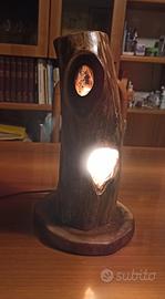 Lampada per arredo rustico in legno realizzata con un tronco di olmo scavato dal picchio