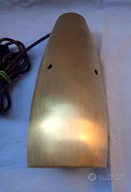 Lampada da Chiesa anno 1955, a sospensione con solo cavo, in ottone modello tronco di cono bombato, e perfettamente funzionante, sono presenti 4 fori a metà del cono, filo con interruttore e spina dell'epoca, porta lampada interno nero dell'epoca, misura altezza cm 22,5, diametro base 9, circonferenza dal basso verso l'alto, 31,5, 31, e 24, peso grammi 576. minuscola fitta sull'angolo superiore quasi impercettibile.