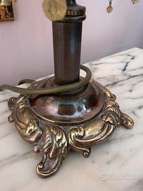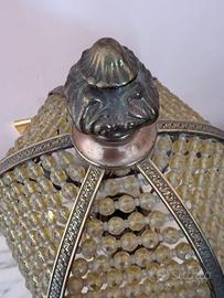 Deliziosa lampada da tavolo vintage con base in metallo dorato e paralume a cupola interamente rivestito di perline color ambra e frange di cristalli tubolari. Produce una luce calda e soffusa, perfetta per creare un'atmosfera intima e rétro sul comodino o su una scrivania classica. Un piccolo gioiello di artigianato d'altri tempi.