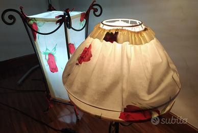Lampada da comodino in ferro battuto con paralume in cotone in fantasia floreale.