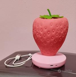 Simpatica lampada a forma di fragola con cavo USB, tasto accensione touch da cui si può regolare l' intensità della luce rossa. 3 gradi di intensità: minima, media, massima (in foto minima e massima). Fa tantissima luce già al livello minimo, e anche se non posizionata sul comodino illumina benissimo tutta la stanza, ma la luce è comunque soffusa e rilassante essendo rossa. È necessaria solo una spina con entrata USB per collegarla alla corrente. NUOVA.