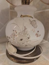 ampada da comodino vintage in ceramica decorata con motivo floreale e farfalle, con base tonda in ottone, paralume in tessuto chiaro stile classico. Rifinita e realizzata in Italia.