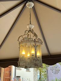 Gabbia cilindrica in metallo con decorazioni a fleur-de-lis e riccioli ornamentali. Metallo bianco/crema con effetto decapato (finta usura) per un look antico. Illuminazione: All'interno del vetro, ospita quattro lampadine a LED con forma a fiamma, che simulano delle candele.