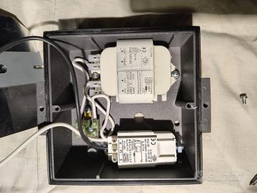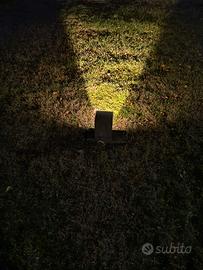 base 15 x 17 h 19,8. Anno produzione 2011 . Usato, buone condizioni . Produce un cono di luce rettangolare di proporzione 2 : 1 .(a 4 metri di distanza l'area illuminata è circa 2 x 4 metri). Lampada di design, fusione in alluminio colore grigio, viteria inox, isolamento IP65 (curare l'uscita cavo alimentazione). Fornito con lampadina funzionante. Nove pezzi disponibili, vendibili separatamente.