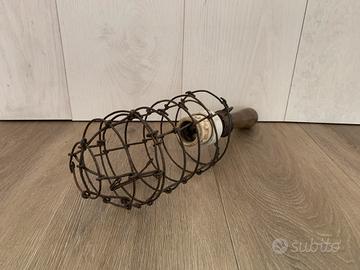 Manico in legno, portalampada in ceramica e gabbia di protezione in metallo con pagina originale.