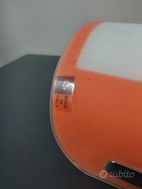 Lampada da muro in vetro soffiato satinato e curvato, cornice serigrafata color arancio pesca, montatura verniciata bianca, particolari cromati, un attacco E14 Dimensioni L. 22 x H. 15 x P. 9 cm NUOVA, senza imballo originale