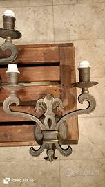 Lampada ( applique ) da parete a due luci in ottone antichizzato completa di impianto elettrico a norma CE, supporta due lampadine attacco E14 2x 60 watt. Supporta lampadine a risparmio energetico e a led, consigliata luce calda. La lampada è trattata quindi non si altera nel tempo.