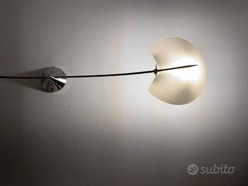 Lampada da parete dal design moderno ed elegante, ideale per soggiorno, camera da letto o corridoio. Struttura in metallo cromato con braccio sottile e diffusore in vetro satinato a forma semicircolare che crea una luce soffusa e piacevole. Perfettamente funzionante e in ottime condizioni estetiche. Ideale per chi cerca un complemento d’arredo raffinato e originale.