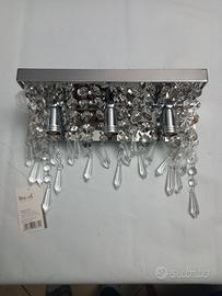 elegante e moderna lampada da parete in metallo cromato,cablata con 3 lampadine attacco g9,(incluse 3 lampade alogene)può tranquillamente usare lampade a led,rifinita con pendaglieria in cristallo,dimensioni Larghezza cm29,altezza cm.18,sporgenza cm 11,3,mai usato,il prezzo indicato è per un pezzo,ideale per ambienti moderno/classico elegante,disponibili 2 pezzi