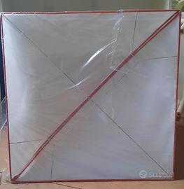 Grande lampada quadrata in policarbonato, scenografica, adatta a valorizzare una parete o un soffitto, una nicchia. cm 110 x 110 x h cm 30. Bordi rossi rimovibili.