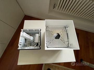 CON CORPO IN PRESSOFUSIONE DI ALLUMINIO E DIFFUSORE IN VETRO, COLORE BIANCO, DIMENSIONI: 18 X 18 X PROFONDITÀ 19 CM, TENUTA BENISSIMO.