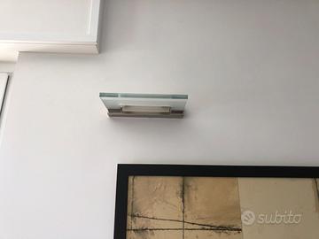 NR 1 lampada da parete modello ACABA di Rossini Illuminazione. Struttura in metallo cromato, vetro lastra temperato (spessore 15mm) e diffusore in vetro pirex satinato a copertura della fonte luminosa. Attacco R7s78, dimensione 280 mm - 140 mm