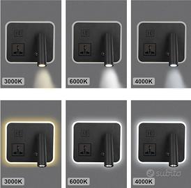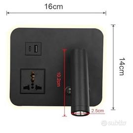 Lampada da parete da lettura orientabile con 3 tonalità luce bianca più luce ambiente sempre a 3 tonalità, più 1 presa di corrente universale più 2 prese USB Type-C e Type-A