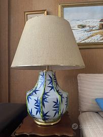 Vendo lampada da tavolo di design con paralume in tessuto beige e base in ceramica decorata con motivi a foglie di bambù in tonalità blu e verde, rifinita con eleganti dettagli dorati. La lampada ha uno stile raffinato e senza tempo, ideale per salotto, camera da letto o studio. Illuminazione calda e morbida, perfetta per creare un'atmosfera accogliente. Condizioni ottime, nessun difetto visibile.