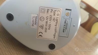 Lampada da scrivania giallo grigia, cavo circa 150cm ,35W alogena (con vetro di protezione ), estensibile e orientabile. Perfettamente funzionante con un difetto estetico visibile in foto (piccola crepa sulla base gialla).