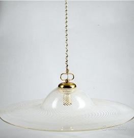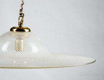 Bellissima lampada da soffitto in vetro spirale bianco e trasparente anni 80 con attacco in ottone. Design simile ad un grande cappello . Diametro 69 cm . Preferisco consegna a mano vista la fragilità.