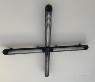La terza lampada è disposta a forma di croce composta da quattro bracci tubulari scuri con una griglia metallica che copre la fonte luminosa.
