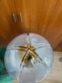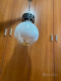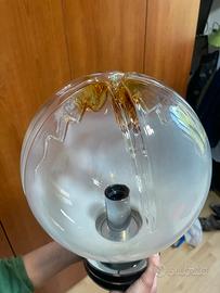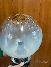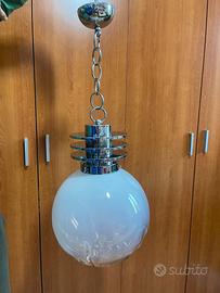 Originale lampada da soffitto vintage del marchio Mazzega (Murano, Italia), risalente circa agli anni ’1969’. L’etichetta si è staccata nel tempo, cosa abbastanza comune per oggetti di questo periodo. Paralume sferico in vetro soffiato spesso color bianco latte, con caratteristica apertura inferiore a forma di fiore e sfumature ambrate all’interno del vetro. Tutte le parti metalliche sono cromate, senza plastica. Condizioni: ottime condizioni vintage nessuna crepa o rottura