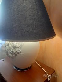 Lampada da tavolo con base bombata in terracotta bianca con disegni in rilievo di frutta.