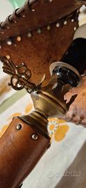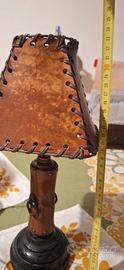 Lampada da tavolo dal design unico, risalente agli anni '50. - Paralume in pelle con cuciture a vista. - Base in legno - Dettagli in ottone