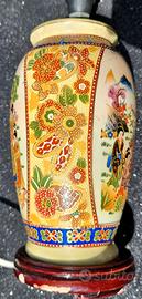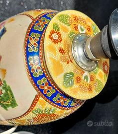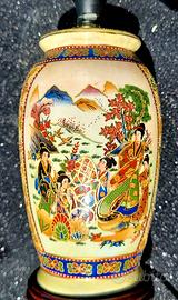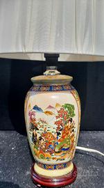Arte orientale - Lampada da tavolo antica in porcellana orientale con geishe - fatta a mano, vintage anni '70. (Giappone / Cina), porcellana e seta Lampada da tavolo con paralume in seta con decoro tradizionale orientale raffigurante scene di vita giapponese: una scena con donne nei tradizionali kimono su uno sfondo naturale con fiori di ciliegio in fiore e un paesaggio montano. Le donne che indossano kimono colorati e hanno acconciature in stile giapponese (forcine kanzashi, cinture obi decorate) sono probabilmente delle geishe. Lo stile delle montagne e dei sakura ricorda l'estetica giapponese: minimalismo, linee pulite, tranquillità. La tavolozza dei colori e gli ornamenti, una bordura con fiori e smalto (stile cloyzone) sono comuni negli oggetti giapponesi della fine del XX secolo. Ma negli anni '70-'90, anche in Cina vennero prodotte lampade decorative con motivo "giapponese", destinate all'esportazione, soprattutto negli Stati Uniti e in Europa. La porcellana cinese era molto richiesta per la sua elevata qualità ed era spesso decorata con scene tradizionali orientali, con splendide figure femminili in kimano sullo sfondo di una pittoresca natura orientale. Particolarmente apprezzate erano le scene di "dame di corte" nei giardini. Sulle lampade non vi sono timbri, firme o marchi, per cui è difficile stabilirne con certezza l'origine. Ideale per interni in stile orientale, boho o classico. Può diventare un forte accento di stile nella camera da letto, nel soggiorno o nell'ufficio, un regalo originale per gli amanti della cultura orientale. Origine:Giappone o Cina, circa anni '70-'80. Anno di produzione:circa 1970-1980 Materiali porcellana (base),seta (paralume incluso nel prezzo),legno (supporto) (20+5)h x 11d,480gr Condizioni:eccellenti,perfettamente funzionante,minimi segni del tempo sul supporto (presente una scheggiatura che gli conferisce un aspetto più antico con segni del tempo,tanto apprezzato dai veri collezionisti di oggetti antichi)
