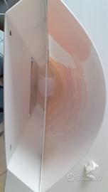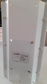 Struttura in policarbonato bianco e bottoncini laterali in plastica bianca. Una lampada leggerissima e dal materiale resistente e infrangibile. Luce morbida e diffusa.