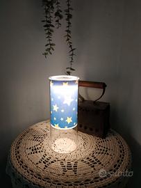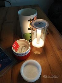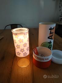 Vendo lampada da tavolo personalizzabile con 4 grafiche intercambiabili (fiori, cuori, stelle, spazio) e un foglio bianco da decorare a piacere. Realizzata in vetro molto spesso con modulo luminoso LED a luce calda, controllo touch sulla parte superiore per accendere, spegnere o regolare l’intensità. Funziona senza fili con batteria ricaricabile (cavo incluso) e può essere utilizzata anche all’aperto grazie alla protezione IP54, perfetta per giardini o terrazze. Un tocco luminoso per atmosfera intima.