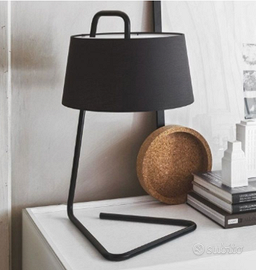 Lampada da tavolo con struttura in metallo e paralume in tessuto dal design minimal e moderno, con base triangolare e forme arrotondate nel complesso.