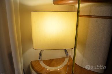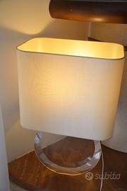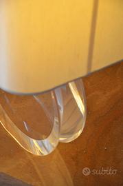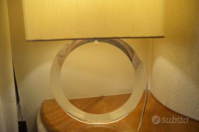 Lampada da tavolo con base circolare in plexiglass trasparente e paralume, anni '70/'80, altezza 58 cm, luce morbida e rilassante