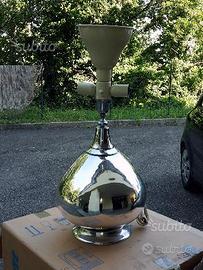 Grande lampada da tavolo con tre attacchi luce E27, base "a pera" in acciaio cromato e paralume cilindrico in tessuto color ecrù con bordo cromato. In perfette condizioni. h= con paralume= 76cm, diametro paralume=41cm, diametro base=22cm, circonferenza massima base=100cm. Solo ritiro a mano.
