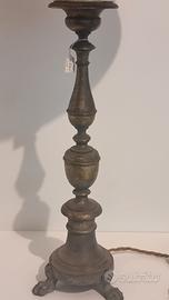 La base poggia su zampette decorative fuse, mentre il fusto presenta il classico elemento a candela con colature, dettaglio tipico delle prime lampade elettriche ispirate ai candelabri antichi.