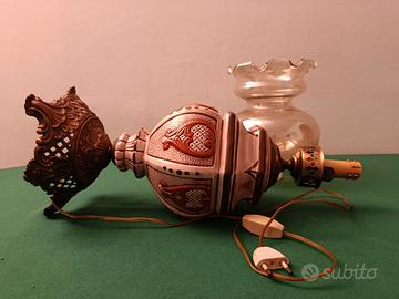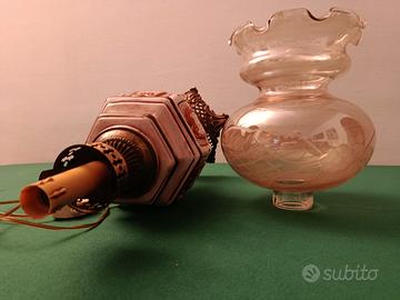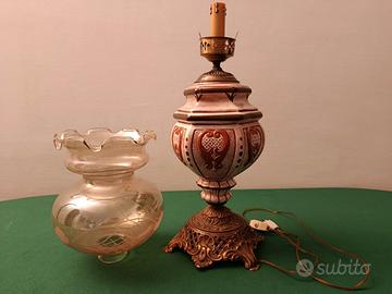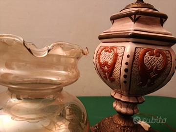 LAMPADA DA TAVOLO D'EPOCA MAGNIFICA LAMPADA DA TAVOLO DEGLI ANNI 50 IN STILE LIBERTY CHE COMBINA DIVERSI MATERIALI E INFLUENSE ARTISTICHE: (CERAMICA DIPINTA-VETRO SOFFIATO-BRONZO). IL DESIGN RICHIAMA I MODELLI DELLE LAMPADE A PETROLIO DEL XIX SECOLO. PRODUZIONE ITALIANA DELLA PRIMA META' DEL SECOLO SCORSO. LE DECORAZIONI SULLA CERAMICA A FORMA DI CUORE SONO TIPICHE DELLA PRODUZIONE ARTISTICA DELL'EPOCA. BASE DECORATA IN BRONZO LAVORATO CON MOTIVI ORNAMENTALI. IL PARALUME E' IN VETRO SOFFIATO IN TONALITA' AMBRA CON DECORAZIONI SABBIATE IN RILIEVO HA LA FORMA A BULBO CON APERTURA SUPERIORE ONDULATA E BORDO RIPIEGATO. IDEALE PER ARREDARE CON ELEGANZA STUDI, SALONI E CAMERE DA LETTO. PARTE ELETTRICA ORIGINALE PERFETTAMENTE FUNZIONANTE. OTTIMO E PERFETTO STATO, COME NUOVA. ALTA CM 59 VENDO A EURO 240,00 NO PERDITEMPO, CONTATTARE SOLO SE REALMENTE INTERESSATI.