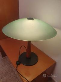 lampada da tavolo da soggiorno con base in metallo, supporto in legno e paralume in vetro. Altezza cm. 50 e diametro del vetro cm. 50. Da ritirare a domicilio a cura dell'acquirente.