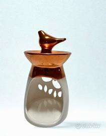 Questo prodotto è una lampada da tavolo decorativa o un diffusore di essenze, caratterizzato da un design elegante e moderno. La base a forma di bulbo, in ceramica bianca, presenta delle aperture a petalo che creano un suggestivo gioco di luci. La parte superiore e l'uccellino stilizzato che funge da manico sono rifiniti in un lucido color rame, aggiungendo un tocco di calore e raffinatezza.