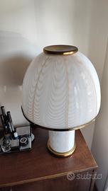 Grande ed elegante lampada da tavolo a base tonda. La lampada è composta da una struttura cilindrica in vetro di Murano opalino con una texture leggermente in rilievo di colore giallo chiaro, la stessa finitura e materiale del diffusore. Questa lampada è provvista di un’accensione differenziata che permette di accendere singolarmente il diffusore, la base o entrambe.