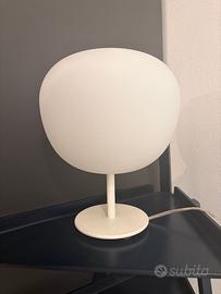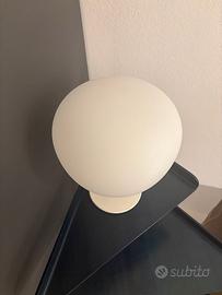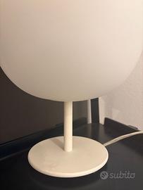 Lampada da tavolo con diffusore in vetro soffiato bianco satinato. Struttura portante in metallo rinforzato con fibra di vetro, verniciato bianco.