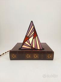 Lampada da tavolo decorativa o ideale come lampada notturna, emette una luce soffusa, ideale anche per delle serate di passione. La lampada è realizzata a partire da un libro vintage utilizzato come base. Il paralume è in vetro colorato realizzato a mano con la Tecnica Tiffany. La lampada viene fornita con una lampadina led ed è corredata di un cavo in tessuto vintage per essere collegata alla presa di corrente. Il disegno del paralume prende ispirazione dallo stile art Deco per un arredamento raffinato e senza tempo
