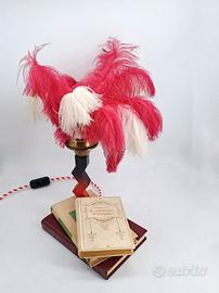 Particolare lampada da tavolo di realizzazione artigianale a partire dal recupero di vecchi libri vintage, asta in cemento e paralume realizzato con vere piume di pavone, per un'atmosfera da boudoir molto retro, adatta come luce notturna, decorativa ma anche come abatjour a fianco del letto. La lampada viene fornita con una lampadina a led a luce calda ed è corredata di un originale cavo a strisce in tessuto in perfetto stile vintage
