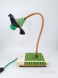 Particolare lampada da tavolo di realizzazione artigianale, fatta a partire dal recupero di un libro vintage, braccio in rame e paralume realizzato con un lp 45 giri in vinile. La lampada si può utilizzare benissimo come abatjour cambiando la lampadina, viene invece fornita con lampadina verde al led per creare luce d'ambiente, corredata di cavo elettrico