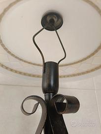 Lampada da tavolo made in Italy in ferro battuto con paralume a conca in vetro smerigliato, caratterizzata da uno stile rustico o classico. Misure 40 cm. x 30 cm. Peso 1.7 kg.