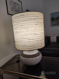 Lampada da tavolo perfettamente funzionante, la base è in pietra grigio chiaro con scanalature grigio scuro. Il paralume è ricamato orizzontalmente in rilievo.