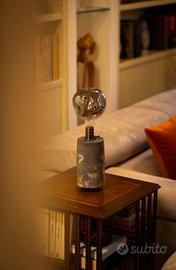 La base cilindrica in cemento unisce solidità e stile contemporaneo, mentre il portalampada vintage con finitura oro ottonato aggiunge un contrasto elegante e ricercato. La lampadina fumé diffonde una luce molto calda e avvolgente, ideale per creare atmosfere accoglienti e decorative.