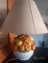 Lampada da tavolo in ceramicacon una base scolpita a mano raffigurante un cesto di frutta dipinta a mano.