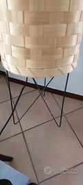 Lampada cilindrica in rattan colore chiaro con fascette che creano un motivo intrecciato, la luce filtra attraverso le fessure creando un effetto davvero carino. Poggia su tre punti in metallo.