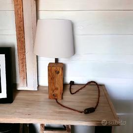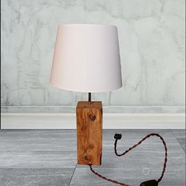 Lampada da tavolo realizzata artigianalmente, nuova, interamente in legno di olivo antico. La lampada è alta cm. 45,5; è costituita da parallelepipedo avente una altezza di cm. 21,5 e i cui lati sono larghi, rispettivamente, cm. 8,5 e 7,2. Non sono apportate variazioni di colore alla essenza originaria. La finitura e lucidatura sono effettuate a mano, quest’ultima tramite aerografo e vernice bicomponente. La lampada è dotata di paralume, cavo elettrico tessile marron, interruttore, lampadina Led a goccia. Il peso complessivo è di Kg. 1,3. L’essenza di olivo antico ne caratterizza, con le sue venature e il suo colore intenso, la sobria fattura volutamente “senza fronzoli”.