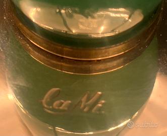 Splendida lampada da tavolo di design prodotta dalla celebre vetreria La Murrina. Un pezzo autentico di modernariato italiano che unisce l'eleganza del vetro artigianale alla solidità dell'ottone. Caratteristiche principali: • Marca: La Murrina (firma incisa "la Mi" presente sulla base). • Materiali: Paralume a fungo in vetro di Murano bianco acidato, stelo in vetro soffiato verde smeraldo e base in ottone dorato lucido. • Dettagli di pregio: La lampada presenta ancora l'adesivo originale "Murano Originale Garantito". Il paralume è fissato con eleganti ganci in vetro verde coordinati allo stelo. • Condizioni: Eccellenti. Il vetro è integro, senza sbeccature o crepe. L'ottone è lucido e l'impianto elettrico è perfettamente funzionante. • Stile: Mid-Century / Hollywood Regency.
