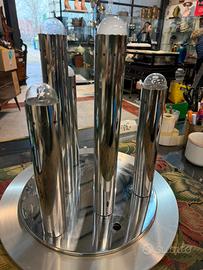 La lampada è composta da 6 cilindri in acciaio cromato di diverse altezze, montati su una solida base circolare in metallo spazzolato. La disposizione sfalsata dei tubolari crea un gioco di riflessi e luci architettonico, tipico delle produzioni d'avanguardia dell'epoca.
