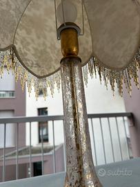 Lampada da tavolo con base in ottone, stelo vetro di murano decorato e paralume in seta ricamata oro. Pezzo unico