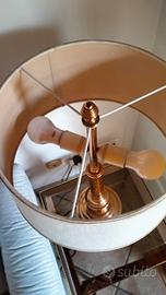 Lampada in ottone dorato e effetto radica. Paralume in tessuto. Altezza 70 cm.
